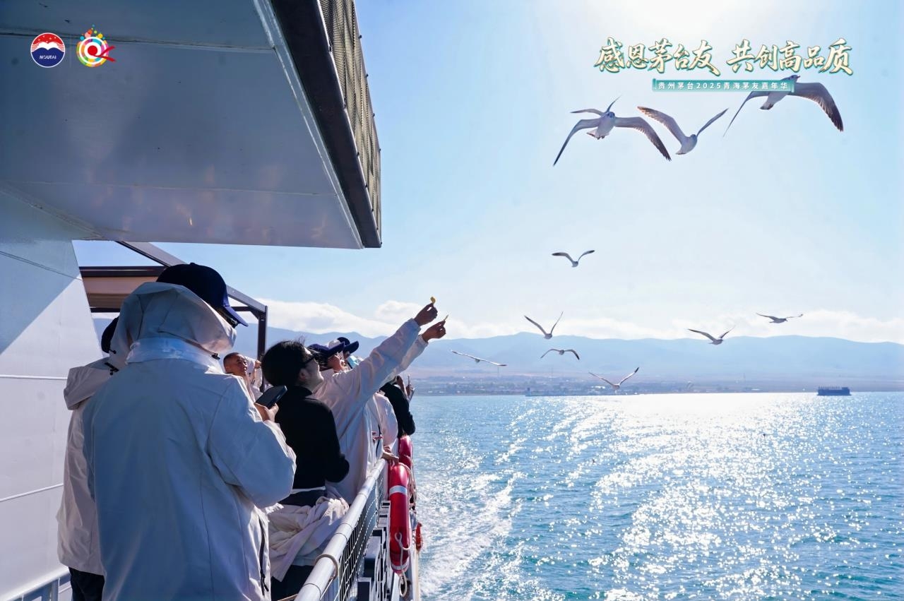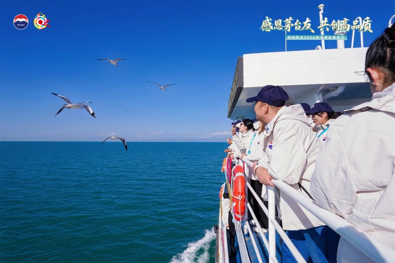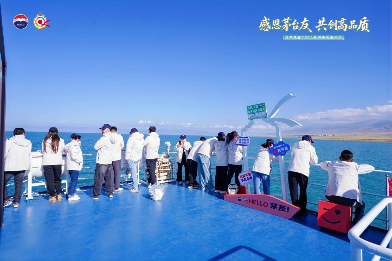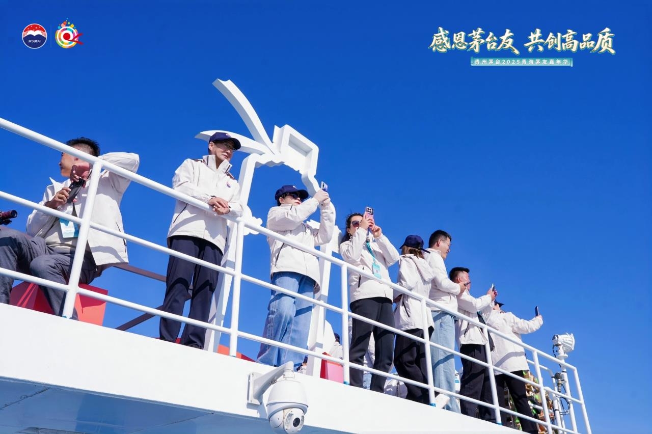在“茅台集结号”游轮上,茅友们泛舟湖面,在澄澈湖水与连绵雪山的映衬下,尽情感受青海湖的风光旖旎。游轮从二郎剑码头启航,驶向湖心深处,让大家从不同角度欣赏青海湖的壮美。整个下午,欢声笑语不绝于耳,茅友们在互动中既领略了青海湖的壮美,也深化了对茅台工艺与自然共生理念的体会。