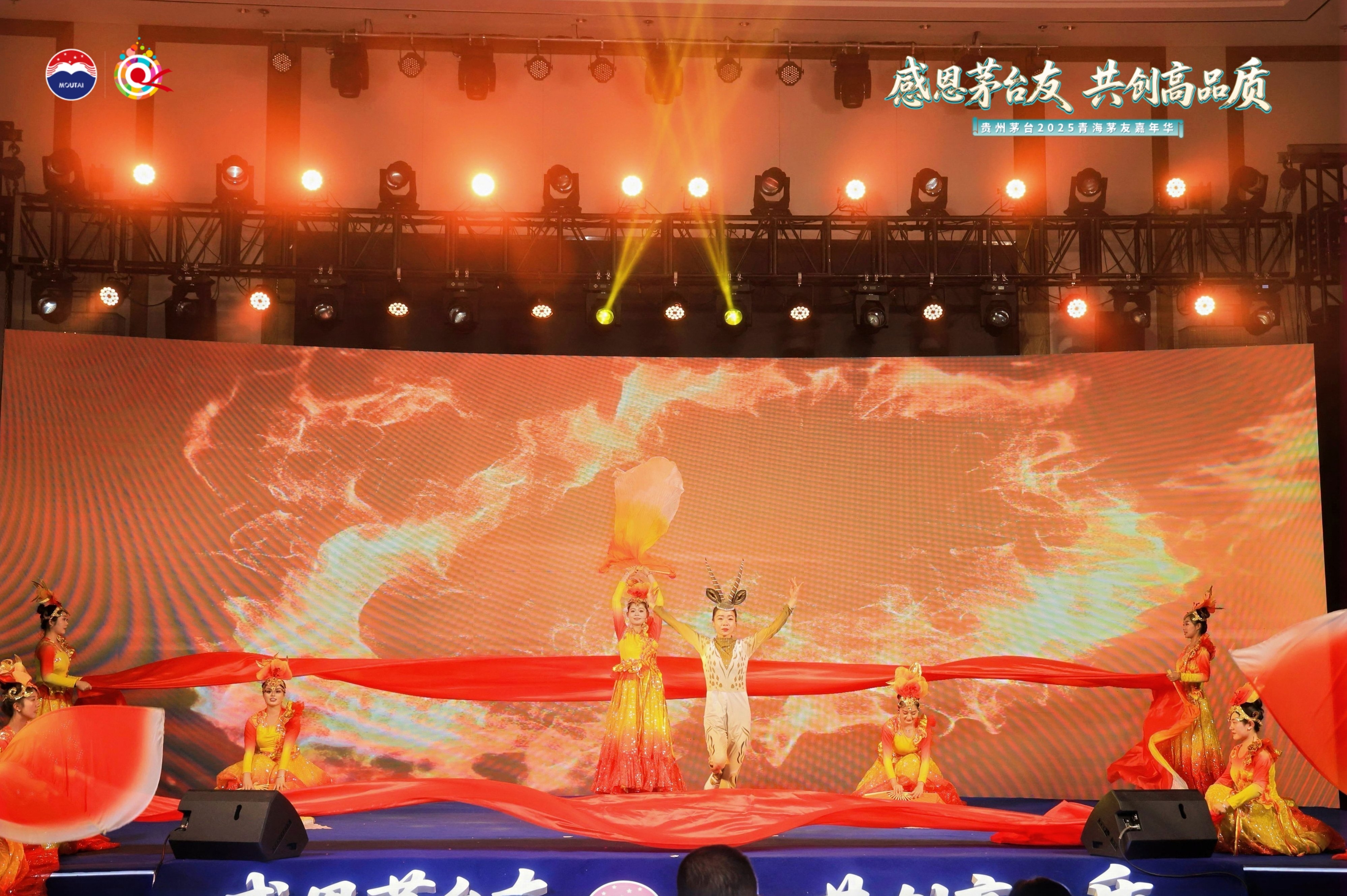 晚宴现场,舞蹈《飞天遇羚》融合敦煌艺术与藏族文化,在欢声笑语中,茅友们举杯致意,诉说着茅台与茅友之间深厚的情谊与共同的价值追求。